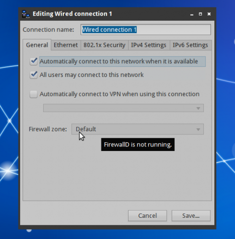 下图中,显示的是网络连接设置界面,用户可以为网络接口指定一个防火墙区域。但问题是提供该功能的防火墙程序FirewallD根本就没有安装,尽管用户可以从仓库中自行安装,也许是为了遵循KISS原则,但是默认连最基本的安全程序都没有,这样的发行版显然对安全问题非常不重视。