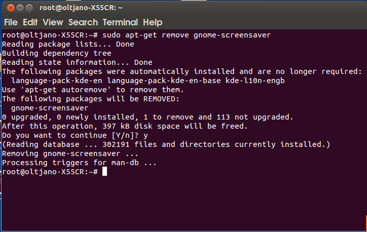 在安装一个新的屏幕保护之前我们必须卸载默认屏幕保护,运行 ‘sudo apt-get remove gnome-screensaver’ ,见图二。