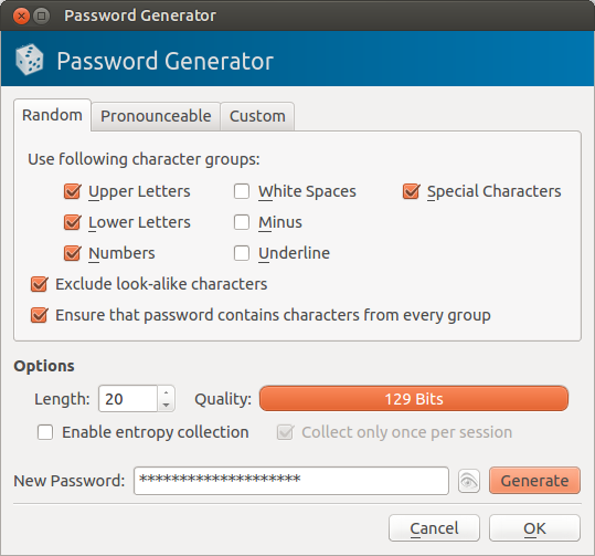 使用该应用还是相当直观明了的。你可以添加分组,然后在分组里添加密码。KeePassX带有一个很方便的密码生成器,当你需要输入一个密码的时候可以使用该生成器,而不用自己构思一个。我倾向于使用所有基本的字符以及挑选的特殊的字符来生成我的密码,20个字符的长度,当然这得看你访问的网站接不接受了。
