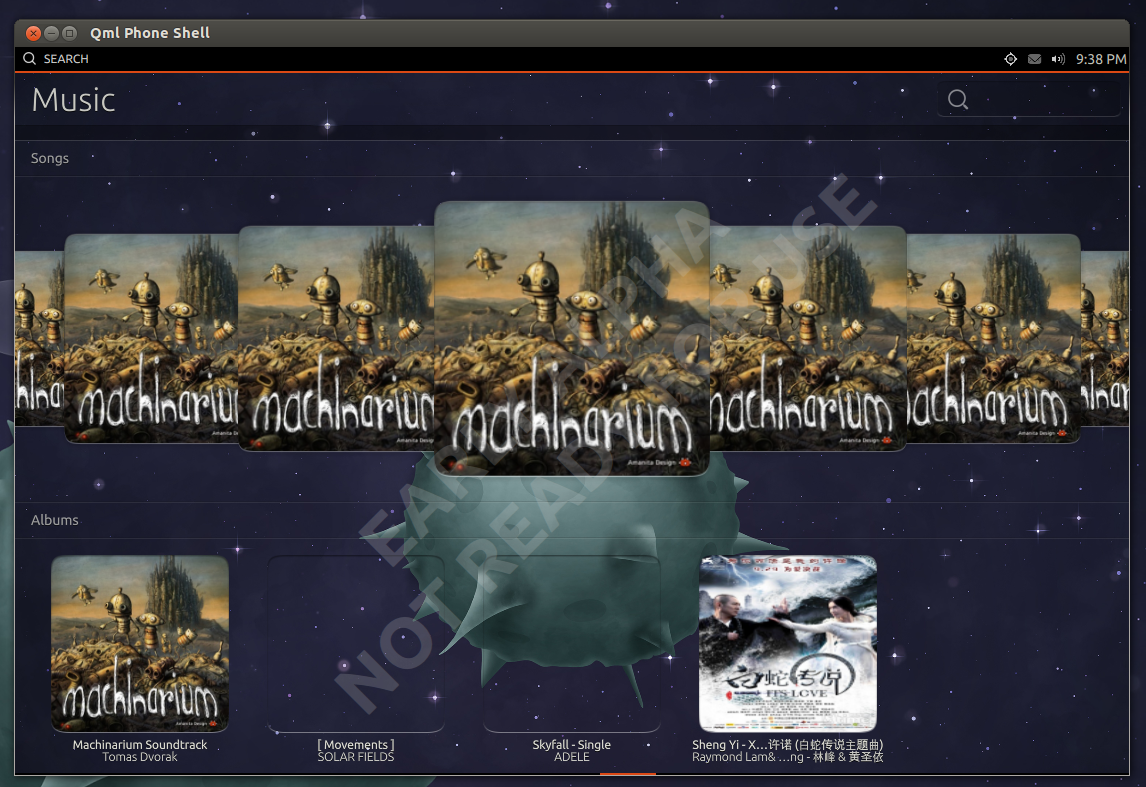 最新版本的 Unity 8 在 Music 域中为 coverflow 效果增加了不少细节,使用巧妙精致的形状渲染音乐的封面(音乐曲目的大号缩略图)。