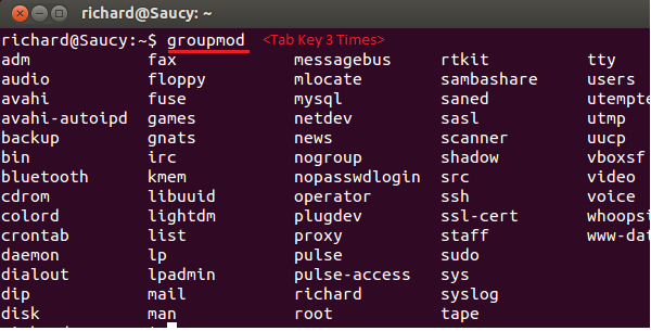 查看Ubuntu上所有的组,键入命令groupmod并(连按三次tab键)