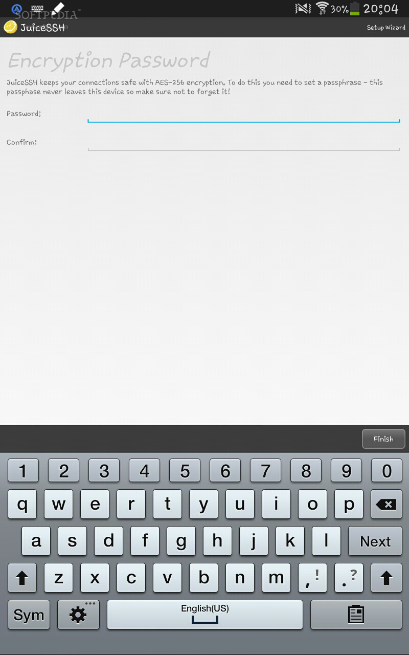 一旦软件安装完毕,运行它,然后你会要求输入一个加密的密码以保证安全连接的安全。这个密码由AES-256进行加密,因此除非你的设备被偷,否则没有人能够获取他们。