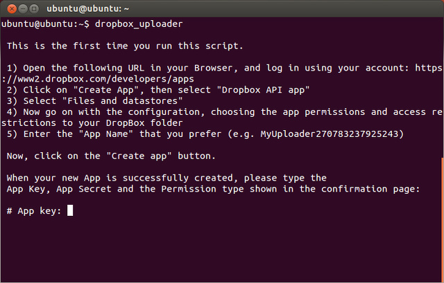 当你运行最后一条命令后,脚本会提醒你这是你第一次运行这个脚本。它将告诉你去浏览一个Dropbox的特定网页以便访问你的账户。它还会告诉你所有你需要放入网站的信息,这是为了让Dropbox给你App Key和App Secret以及赋予这个脚本你给予的访问权限。现在脚本就拥有了访问你账户的合法授权了。