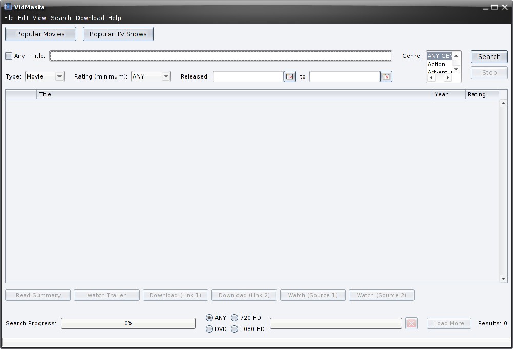 搜索电影电视剧非常容易。在标题框里键入电影的名字,选择电影种类和电影格式,例如“任何”,“DVD”,“720HD”,“1080HD”等。然后敲击Enter键开始搜素。你还可以通过评价来过滤搜素结果。假如你不知道电影的名字,你可以在菜单栏里勾选“任何”。