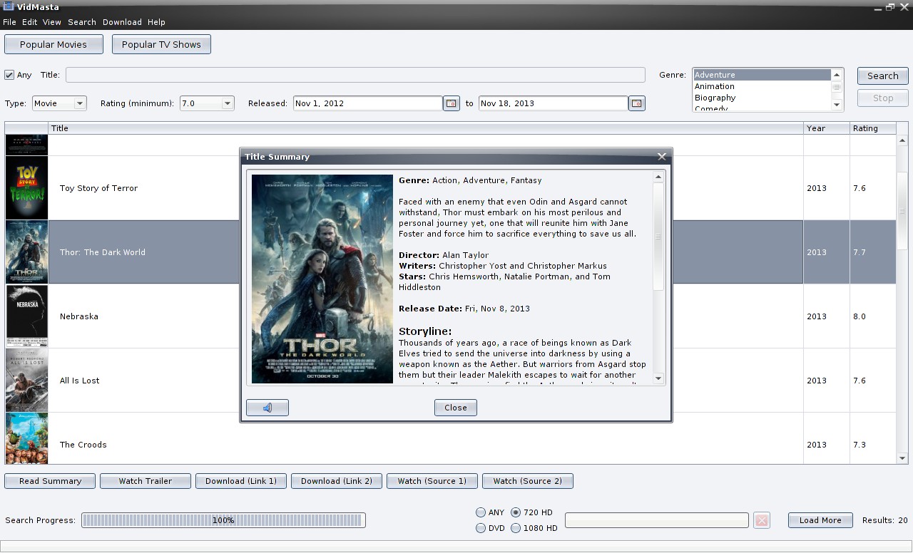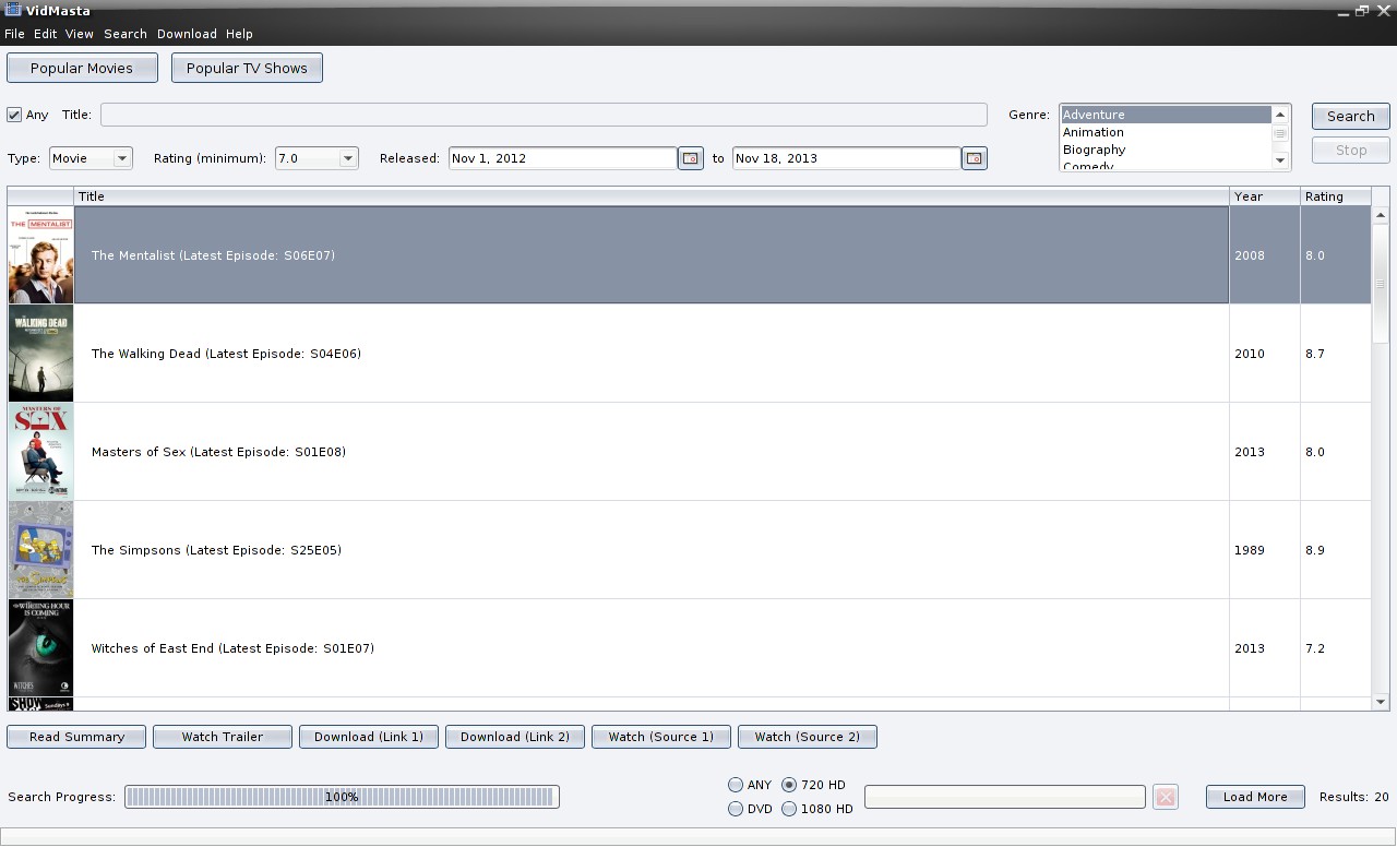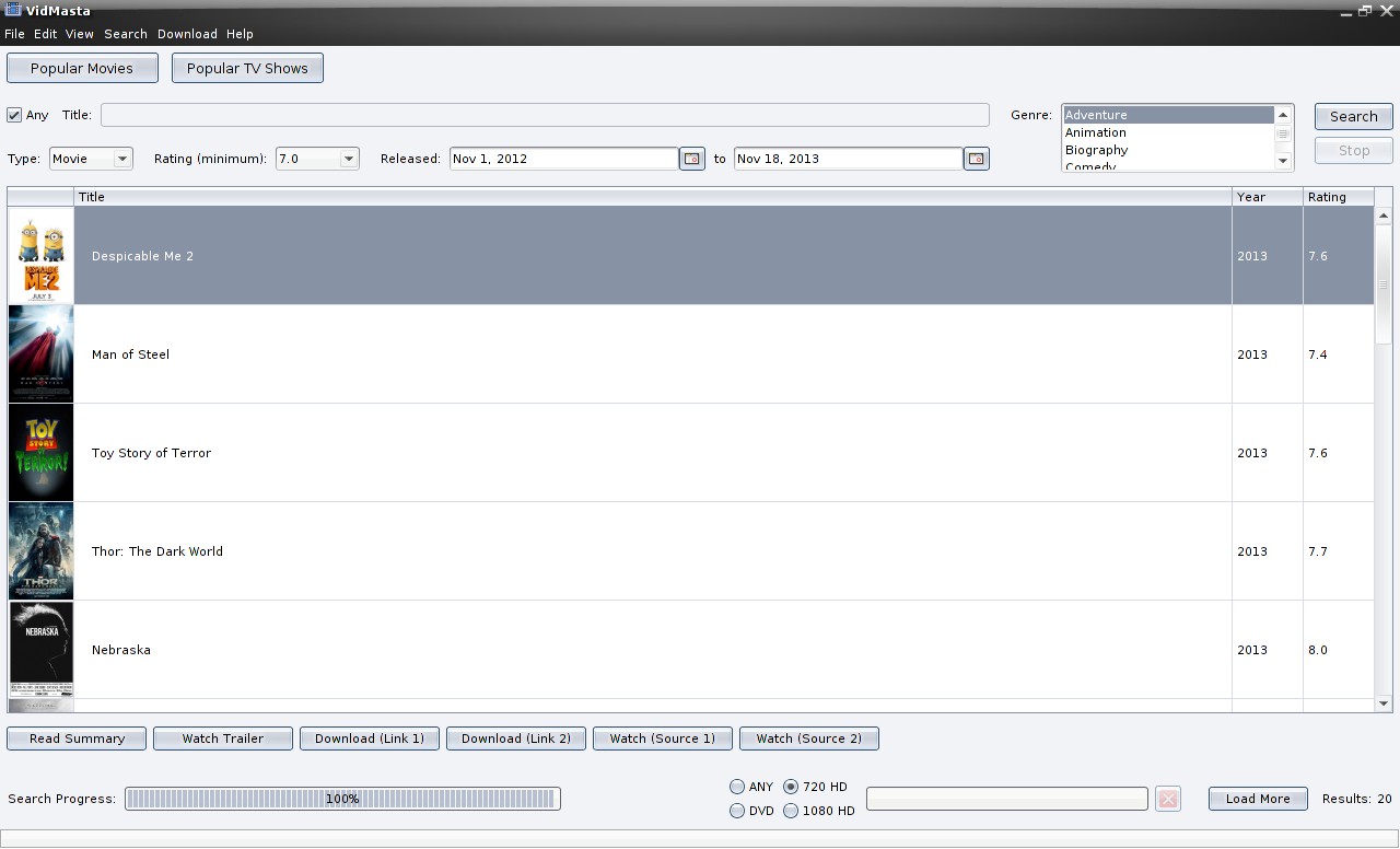例如我要搜索冒险类的清晰度为720HD并在在2012年的11月第一周的今天上映的电影。一旦你敲击搜索按钮,VidMasta就会从www.imdb.com网站抓取搜索结果,并显示你每次搜索的关键词。下面是输出的样例。