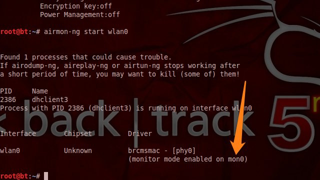 这一命令将会输出监控模式接口的名称,如下图中箭头所示,一般情况下,都叫做mon0。