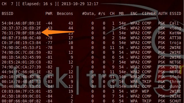 现在,手里有了BSSID和监控接口的名称,万事俱备,只欠破解了。