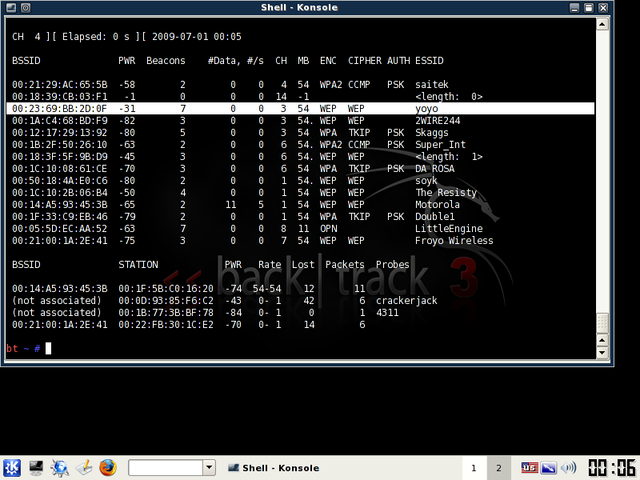 就可以看见你周围的wifi网络列表了。当你认准了你的目标后,按Ctrl+C结束列表。高亮你感兴趣的网络,同时记录下两样数据:它的BSSID和它的Channel(讯道,标签为CH的那列),就像下面的截图。很明显你想要破解的网络需要是WEP加密的,而不是WPA或者其他加密方式。
