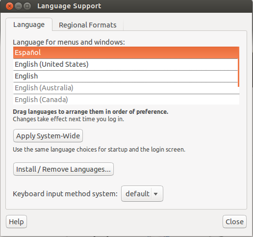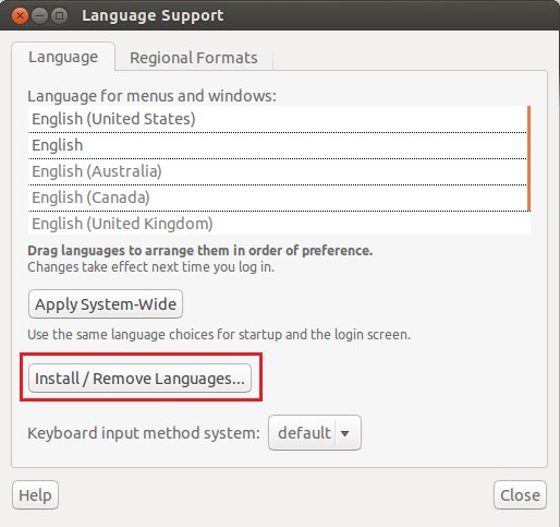 如果提示要你安装额外的语言支持,那就直接安装。如果没有,那么就单击 Install / Remove (安装/删除)去安装新的语言包,然后,选择你想安装的语言来安装。最后,拖动新的语言到列表的顶端并且保存。这些更改只会应用在你的个人帐号上。如果你想应用在全局范围内,单击 Apply System-Wide(应用到全局设置)