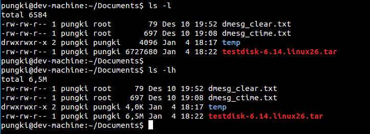 以字节为单位看大小可能会不方便。6.5M读起来比6727680字节更简单。要这么做,我们可以使用-h与**-l结合的参数。-h参数意味着便于人识别**。