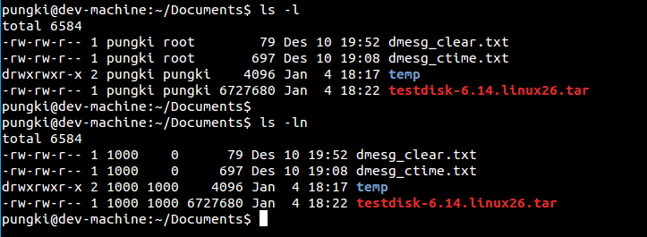 如果你想以数字方式列出项的所有者和所有组(即UID和GID),我们可以带**-n**选项使用ls命令。这里是个例子。