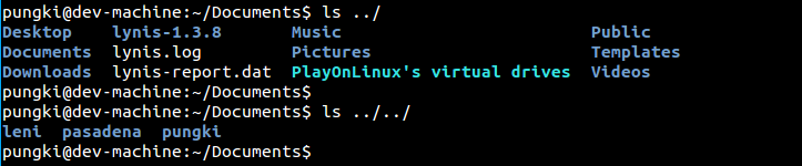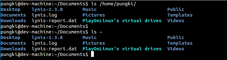 要列出你的主目录,你可以用"~"(波浪号)来代表它。这样你就不必输入完整的目录名。让我们假设家文件名为**/home/pungki**,那么波浪号就对/home/pungki有意义了。