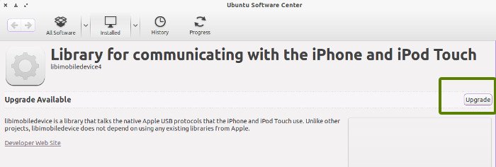 双击下载后的.deb文件进行安装。提醒一下,因为Ubuntu和Linux Mint默认已经安装了这个库,所以你看到的会是升级库libimobiledevice,而不是安装它。