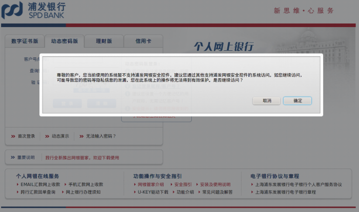 上午,对浦发网银进行测试,已经可以登录。登录之前会对用户给出提示,并且修改浏览器UA已经无法骗过网站了。