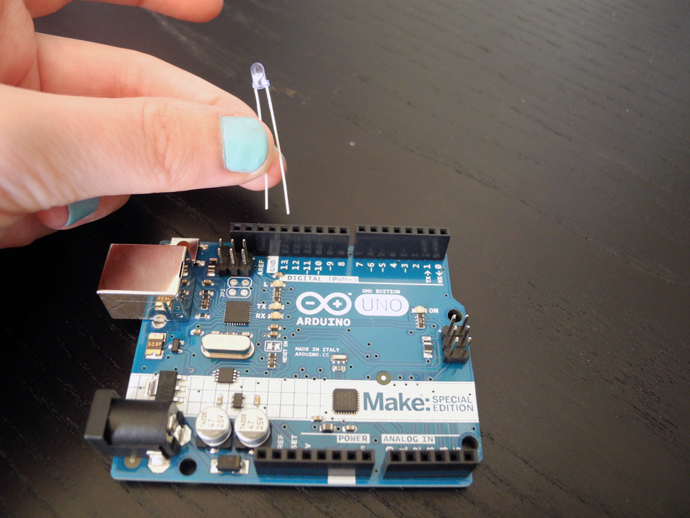 首先,设置硬件,将LED的两个脚分别插到到Arduino的公共地GND和引脚13上。