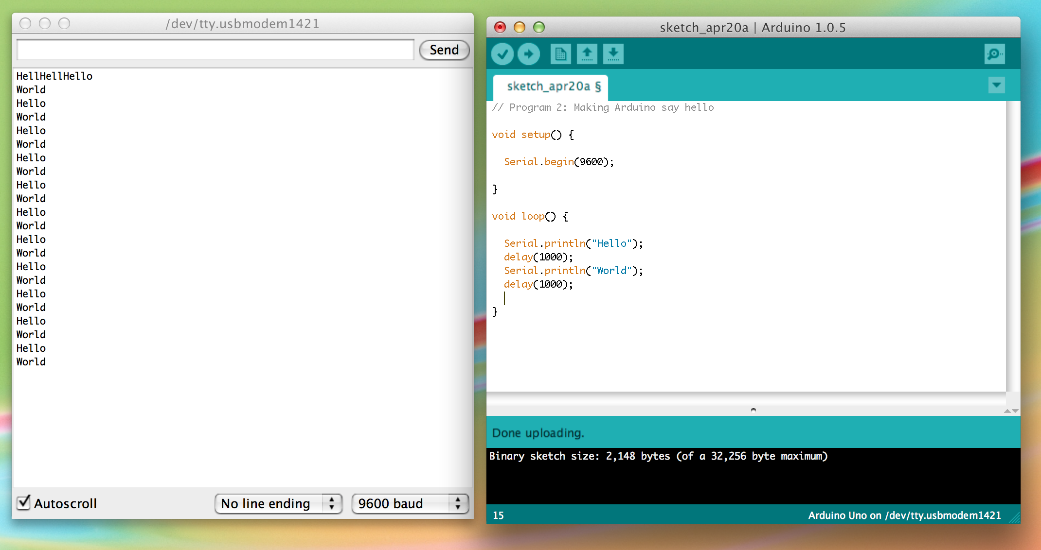 验证你的代码并运行。什么都不会显示,直到你点击Arduino IDE窗口右上角的“Serial Monitor”。你应该看到一个不停输出的“Hello World”,一遍又一遍,直到你拔掉Arduino。你会看到它并不完美:我总是得到一些乱码,但很快它自己就好了。