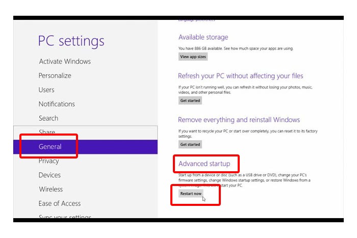Windows 8的:在Windows 8中,你需要进入通用PC设置,并选择高级启动,然后点击立即重新启动:
