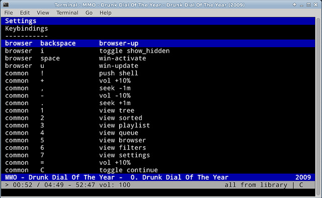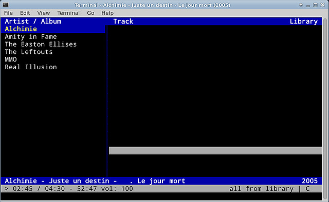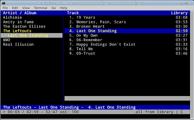 cmus是一个内置了音频播放器的强大的音乐文件管理器。用它的基于ncurses的命令行界面,你可以浏览你的音乐库,并从播放列表或队列中播放音乐,这一切都是在命令行下。