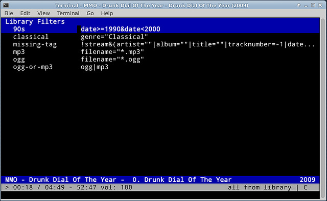 第六界面是一个库过滤器,用来动态创建播放列表。如它听上去的那样,过滤器会遍历你的库,并且只显示符合相关规则定义的音乐。之后我会描述如何定义你自己的过滤器,但是cmus已经自带了一些。要试一下,只要使用: