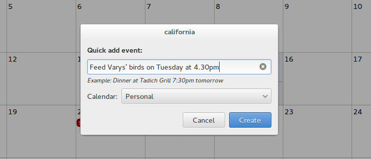 要创建新的事件,点击‘+’图标, 然后在弹出的输入框中使用自然语言输入,输入你想要提交事件的描述(译注:显然你得用英语)。例如, 输入内容“Bake Sansa Stark A Lemon Cake on Wednesday 2.45 PM”将在周三的这个时间(14:45)加入该事件。