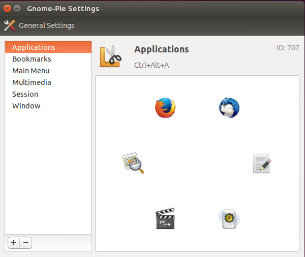 默认的,Gnome-Pie有一个比较可靠的初始配置。首先,你可以使用 Ctrl + Alt + a 调出,它将显示你的系统的基本应用程序。