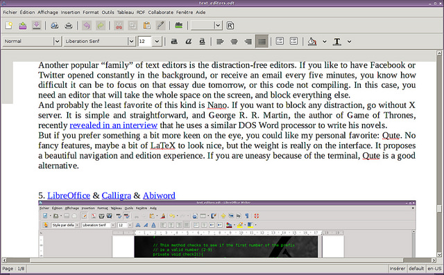 最后,办公套件也是文本编辑器。我不确定你能否轻松使用办公套件编程,但是它确实更适合纯文本编辑,也比LaTeX更容易学习。在这类编辑器中,LibreOffice 和 Calligra 不能避而不谈。这两个编辑器因为它们丰富的特性和响亮的名声成为这类编辑器中的巨兽。这两者我都喜欢,但是很多人明确的偏向于前者。如果你怀念微软的Word处理软件,你会有自己的选择。稍处下风的Abiword相对前面的两个是一个轻量级的选择。如果你的目的只是编辑一个文本文档,不关心电子表格或者数据库,Abiword的特性可以达到理想的效果。