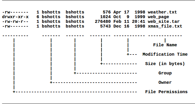 这样,用了长格式后,你可以看到更详细的信息,以及在每行开头类似-rw-r–r– 令人抓狂的标示。实际上,这只是一种组合,代表了各种意义的信息。