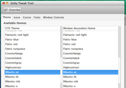 现在打开刚才安装的工具来选择主题,在GTK主题上选择MBuntu。再本地tab上选择Mbuntu-osx在光标tab上选择Mac-cursors.