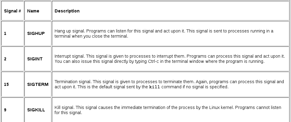 kill的存在,不仅仅是为了终止进程,它最初是设计用来发送信号给进程。当然,有许多kill信号可以使用,根据你使用的应用程序不同而不同。请看下面的表: