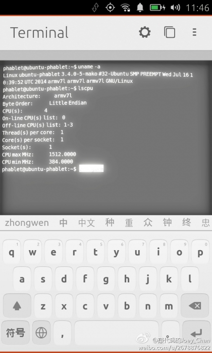 以下截图来自 @敲代码的Joey_Chan ,大家可以先睹为快,期待真机出现,小编现在对 Ubuntu Touch 十分渴望: