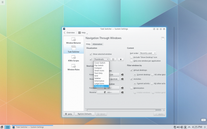 KDE 项目称在像窗口小部件和窗口切换器等菜单中,垂直菜单将取代水平菜单,“提供更好的使用体验”。但并未提及会具体如何。发行文档称挪动窗口切换器至屏幕一端“使用户的注意力更加集中于应用和文档,以完成手头上的工作”。可是当你启用了窗口切换器,嗯,准备切换窗口时,你的注意力更可能是在不同的任务间而不是集中在某一个任务上面。