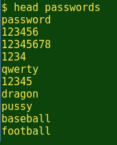 在第一个列表里探讨的是马克.伯内特2011著的关于10000 个最常用的密码汇编。这个列表是有序的、使用最频繁的,也是广为人知的阶乘“密码”的最常用来源之一,与“123456”并列排名第二。在这里,我把该列表放到一个名为“passwords”的文件中,并且使用head命令把排名前10的列出来了: