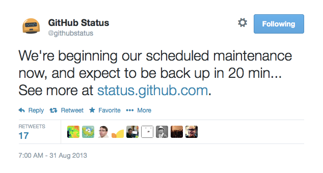 然后我们让 GitHub.com 脱离维护模式,并且让全世界的用户都知道我们的最新状态: