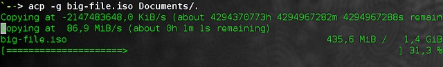 一个 Linux 中最基本的命令就是复制命令: cp。 它几乎和 cd 命令地位相同。 然而, 它的输出非常少。 你可以使用 verbose 模式来实时查看正在被复制的文件, 但如果一个文件非常大的话, 你看着屏幕等待却完全不知道后台在干什么。 一个简单的解决方法是加上一个进度条: 这正是 advcp (advanced cp 的缩写) 所做的! advcp 是 GNU coreutils 的一个 补丁版本, 它提供了 acp 和 amv 命令, 即"高级"的 cp 和 mv 命令. 使用语法如下: