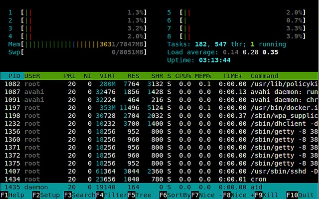 如果你经常使用 top 命令, 很有可能你会喜欢 htop 命令。 top 和 htop 命令都能对正在运行的进程提供了实时查看功能, 但 htop 还拥有一系列 top 命令所没有的人性化功能。 比如, 在 htop 中, 你可以水平或垂直滚动进程列表来查看每个进程的完整命令名, 还可以使用鼠标点击和方向键来进行一些基本的进程操作(比如 kill、 (re)nice 等),而不用输入进程标识符。