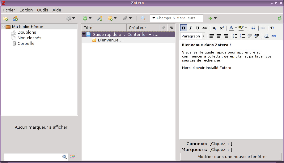 这应该是最著名的参考文献聚集工具,Zotero作为一个浏览器的扩展插件。当然,它也有一个方便的Linux 独立工具。拥有强大的性能,Zotero 很容易上手,并且也可以和LibreOffice 或者是其他的文本编辑器配套使用来管理文档的参考文献。我个人很欣赏其操作界面和插件管理器。可惜的是,如果你对参考文献有很多不同的需求的话,很快就会发现 Zotero 功能有限。