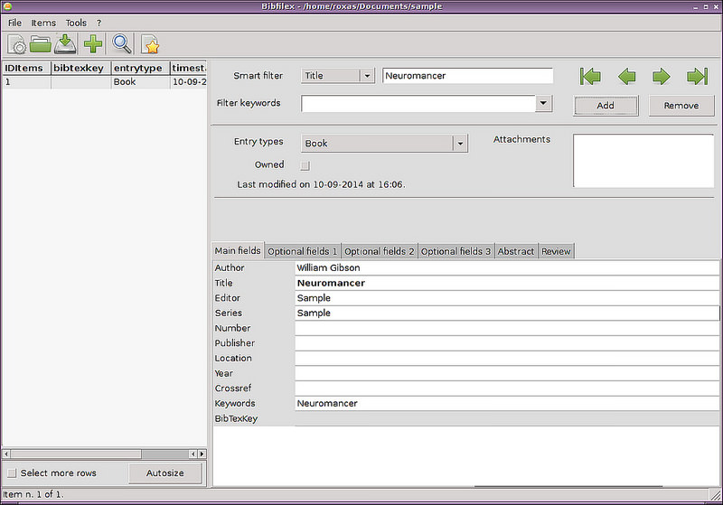 可以运行在Gtk 和Qt 环境中,Bibfilex是一个基于 Biblatex 的界面友好的工具。相对于JabRef 和KBibTex ,缺少了一些高级的功能,但这也让他更加的快速和轻巧。不用想太多,这绝对是快速做文献目录的一个聪明的选择。界面很舒服,仅仅反映了一些必要的功能。我给出了其使用的完全手册,你可以从官方的下载页面去获得。