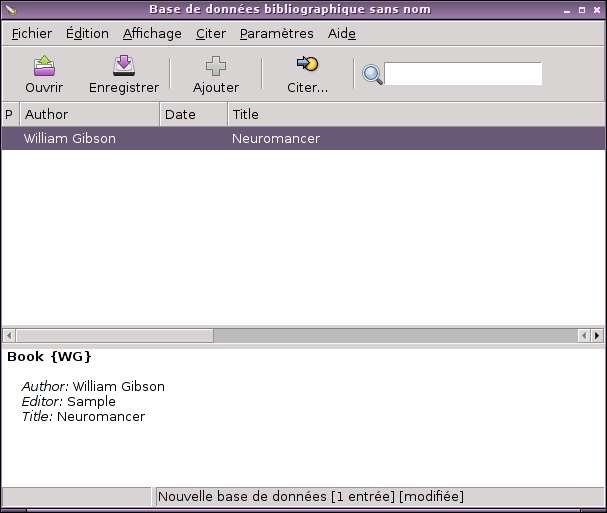 正如它的名字一样,Pybliographer是一个用 Python 写的非图形化的文献目录管理工具。我个人比较喜欢把Pybiographic 当做是图形化的前端。它的界面极其简洁和抽象。如果你仅仅需要输出少数的参考文献,而且也确实没有时间去学习更多的工具软件,那么 Pybliographer 确实是一个不错的选择。有一点点像 Bibfilex 的是,它是以让用户方便、快速的使用为目标的。