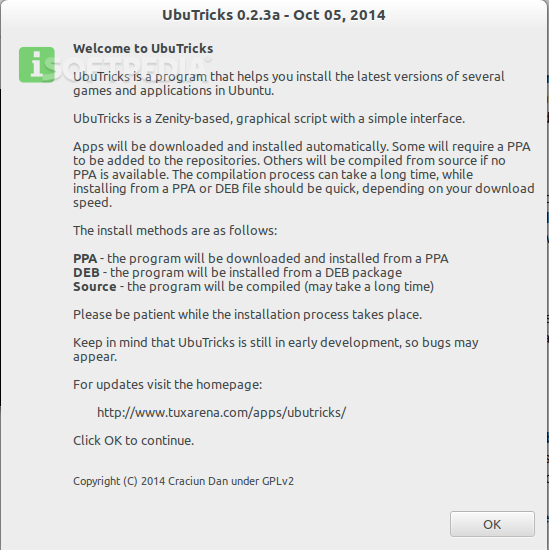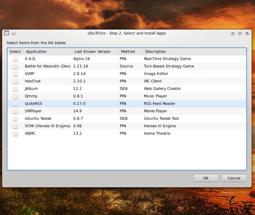 UbuTricks 是一款免费发布的用 Bash 语言编写的脚本型应用程序。它被设计为从最初版本一直向上搜索的方式来帮助您在 Ubuntu Linux 操作系统以及其它 Ubuntu 衍生版本系统上安装最受好评的游戏和图形应用程序的最高版本软件。