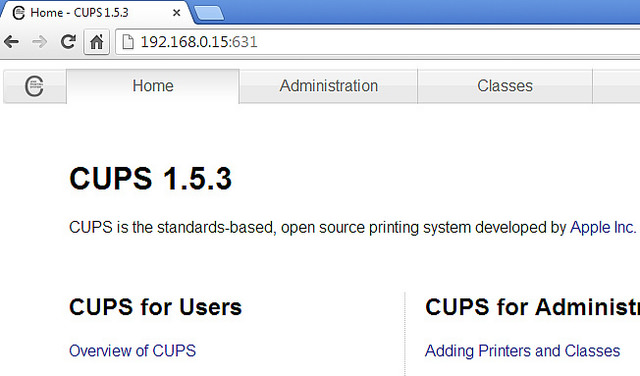 1、 启动网页浏览器,并打开CUPS接口http://:Port,这里在我们的例子中是http://192.168.0.15:631: