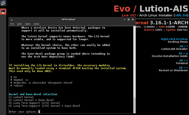 启动这个422MB大小的ISO镜像后,一个由显示在右边的带有选项快捷方式的Conky和一个左边等待运行安装器的LX-Terminal组成的工作区便呈现在我们眼前。