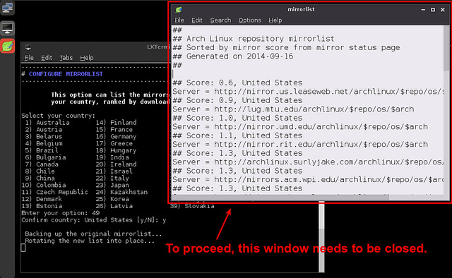 我要提出两点批评:一是在安装器要我选择一个镜像列表时,以及在创建fstab文件时。在这两种情况下,它都另外开了一个终端,给出了一些文本信息提示。这让我花了点时间才搞清楚,原来我得把它关了,安装器才会继续。在创建fstab后,它又会提示你,而你需要关闭终端,并在问你是否想要保存文件时回答‘是’。