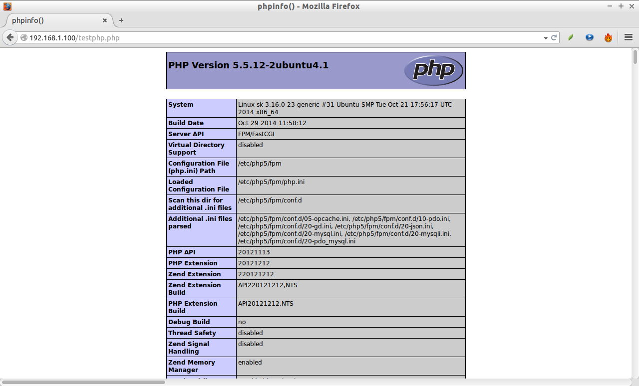 访问地址http://server-ip-address/testphp.php。将显示出所有关于 php 的信息,比如版本、构建日期以及命令等等。