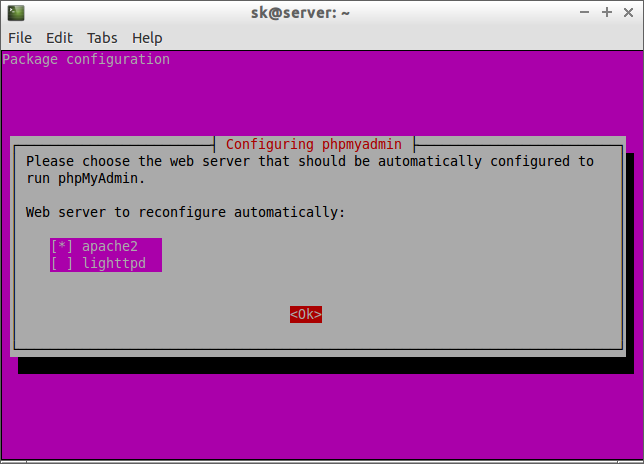 选择一个网页服务器。默认情况下,这里不会显示 nginx。所以,选择 apache 或者 lighttpd,然后我们再把 phpMyAdmin 和 nginx 连接起来工作。