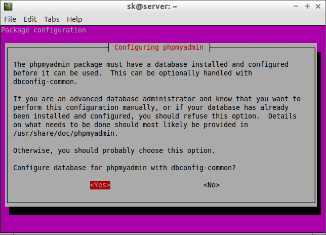 选择‘是’通过dbconfig-common为phpMyAdmin配置数据库。