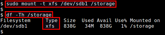 $ sudo mount -t xfs /dev/sdb1 /storage