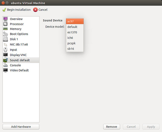 如果你使用的是virsh 而不是virt-manager, 你可以编辑VM相应的配置文件。在节点中查找sound节点,并按照下面的默认声卡型号改成ac97。