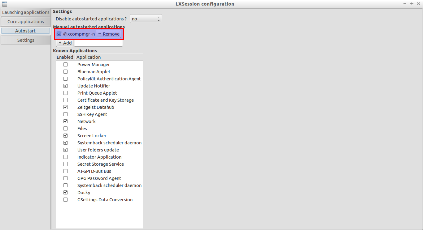 然后,选择菜单(Menu) -> 偏好(Preferences) -> LXSession默认程序(Default applications for LXSession)。选择自动开始(Autostart)选项卡。 在**(+增加)+Add框中输入“@xcompmgr -n**”不带引号。最后点击增加按钮。