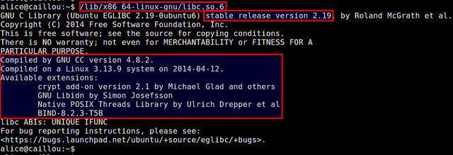另一个方法是在命令行“输入”glibc 库的名称(如,libc.so.6),就像命令一样执行。