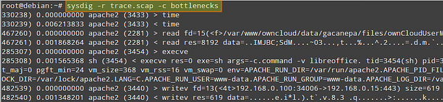 # sysdig -s 4096 -A -c echo_fds fd.cip=192.168.0.100 -r /mnt/sysdig/debian.scap.gz proc.name=apache2